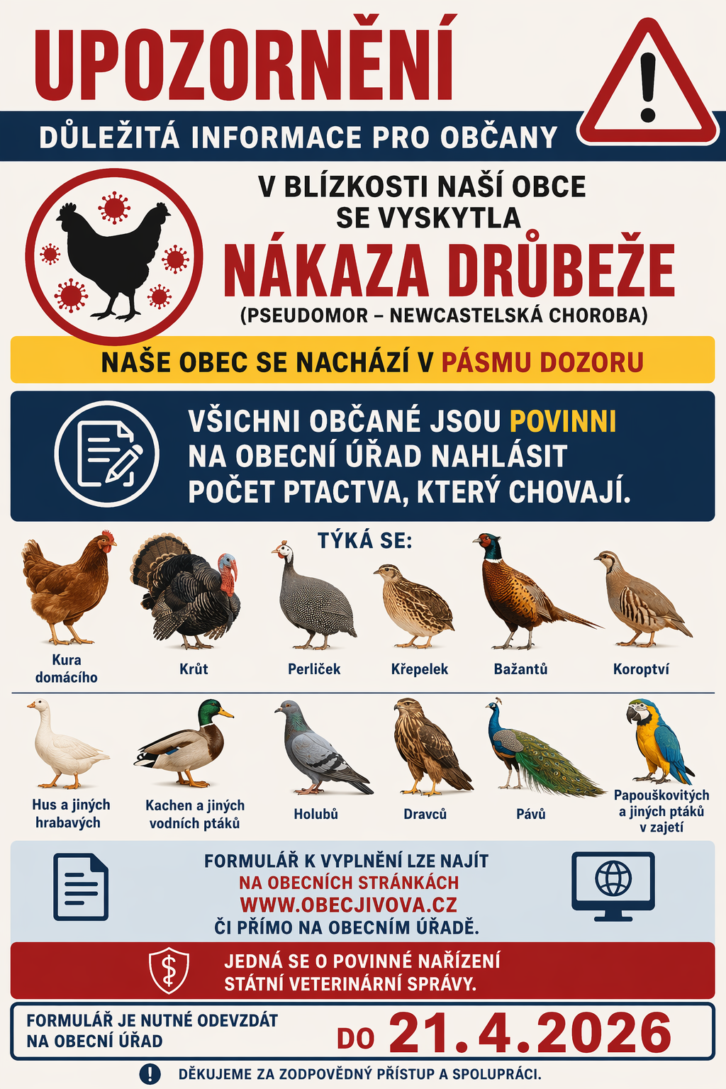 V blízkosti naší obce se vyskytla nákaza drůbeže (pseudomor - Newcastelská choroba) naše obec se nachází v pásmu dozoru, všichni občané jsou povinni na obecní úřad nahlásit počet ptactva, který chovají.